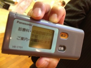 (病院の受付で渡されるPH。この病院ではマイクによる患者さんの呼び出しはありません。個人のPHSに連絡が入ります。待ち時間はどこで過ごしてもOK。電子カルテにも繋がっています)